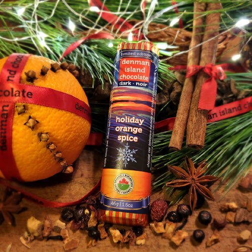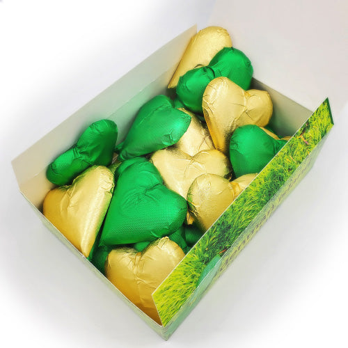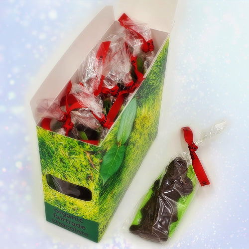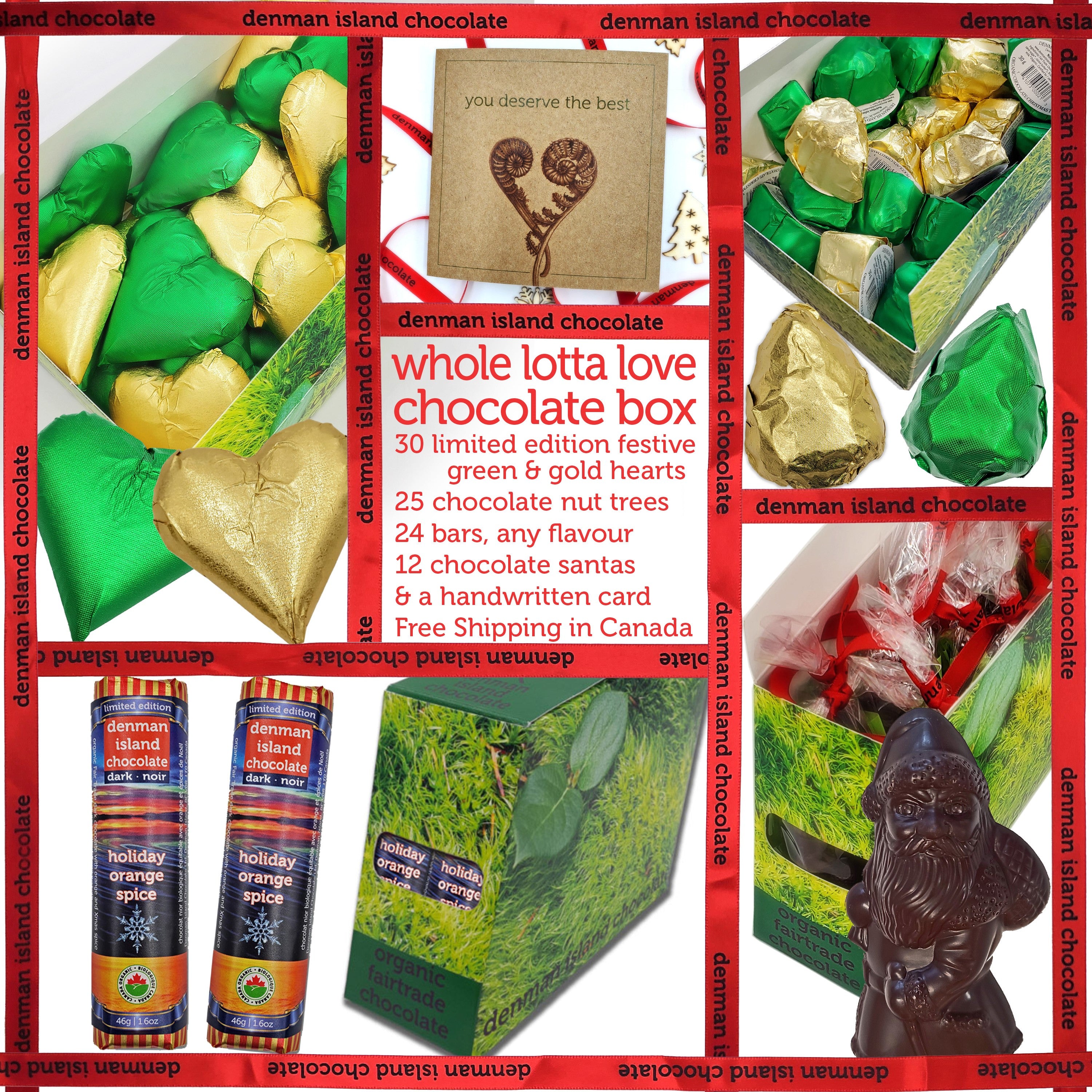 Our biggest box of chocolate love. Stocking stuffers and gifts for all, for when you have a whole lotta love to give. Stock up on ALL our limited edition seasonal specialties, while supplies last. A full case of each: 30 hearts in festive gold and green foil, 25 chocolate Brazil nut trees, 24 seasonal Holiday Orange Spice bars (or bar flavour of your choice), 12 chocolate Santas, and the option of a card with a handwritten note. If this is a gift, please include your message for the card in the comments section of your shopping cart. Always organic, vegan, fair trade and gluten-free. This chocolate box ships free to any address in Canada.